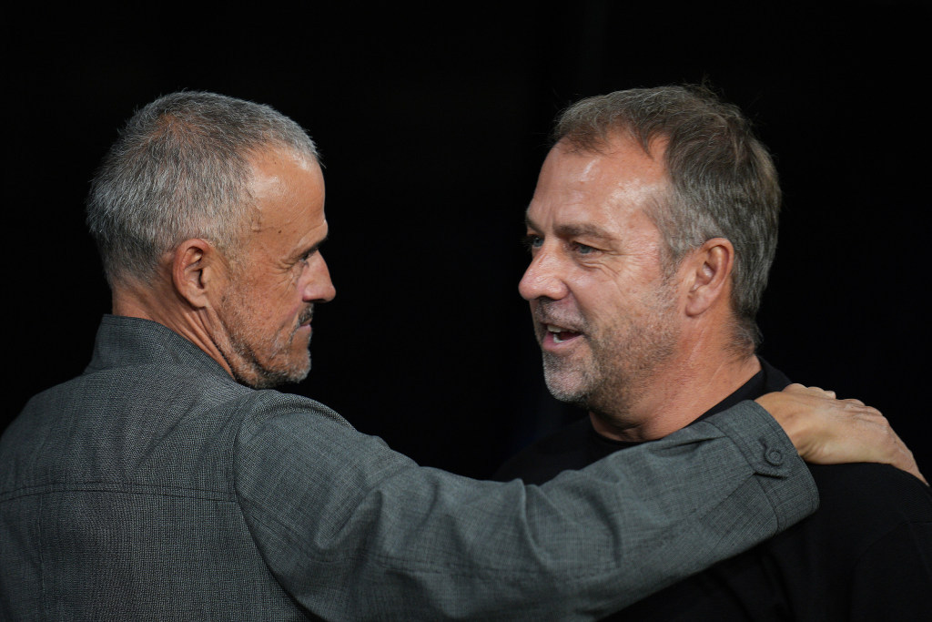 恩里克(左)和弗里克(右)在赛后交流,他们在这个赛季的斗法才刚开始。